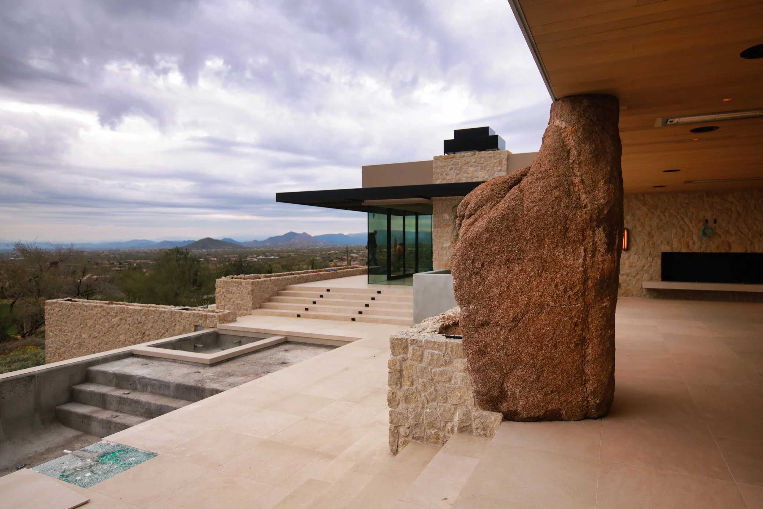 The surrounding desert landscape played a critical role in shaping the design. Located in close proximity to Pinnacle Peak, the site naturally called for materials that reflect the geology of the region. The boulder selected mirrors the scale, texture, and weathered character found on the mountain beyond the home.