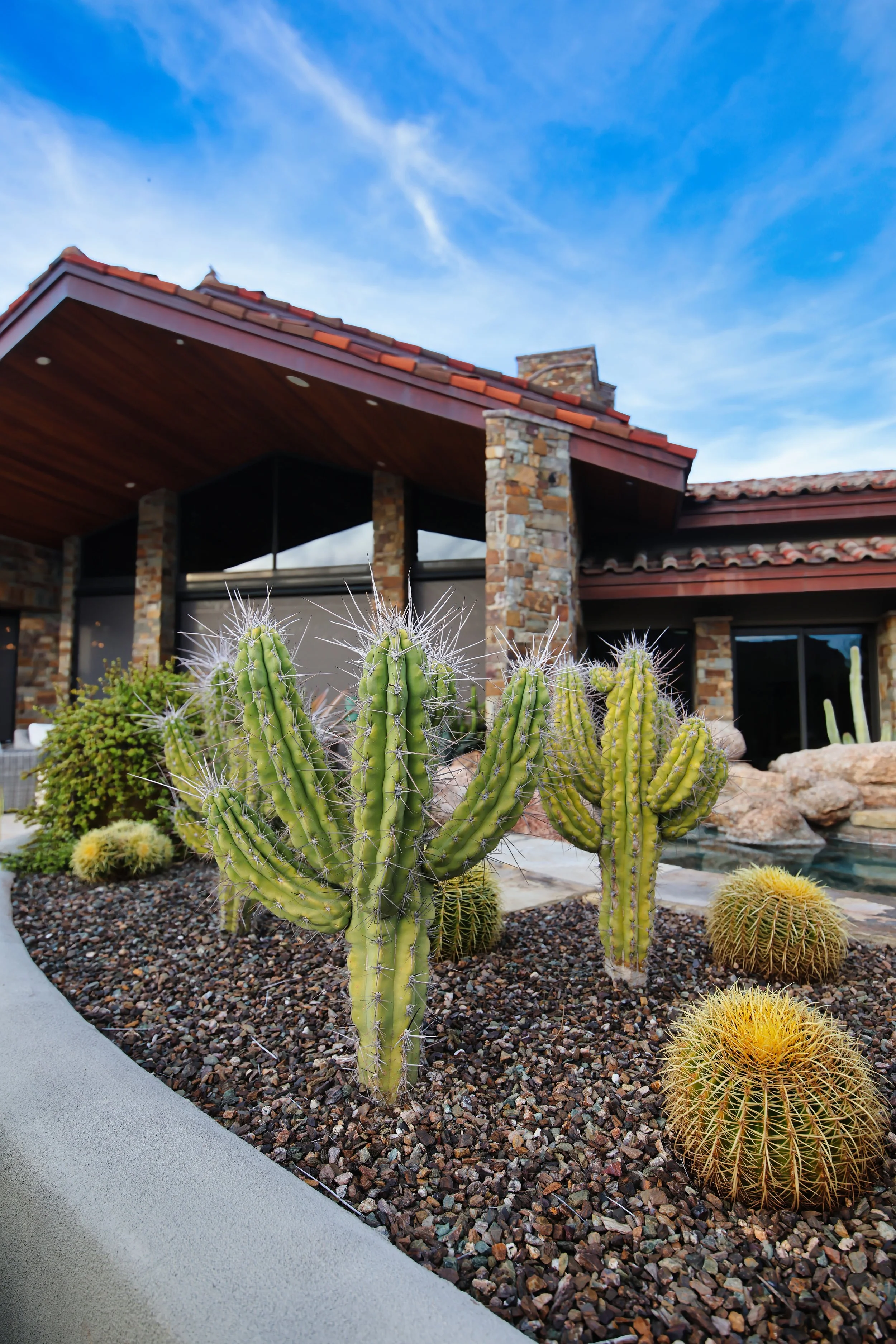 Strong vertical forms were chosen to echo the stone columns and timber beams — creating rhythm and scale without overwhelming the façade. Rounded forms were layered at ground level to soften hardscape edges and introduce repetition. Blue-green accents were intentionally placed to cool the warmth of the stone, while golden tones were used to pull light forward and add contrast against decomposed granite.